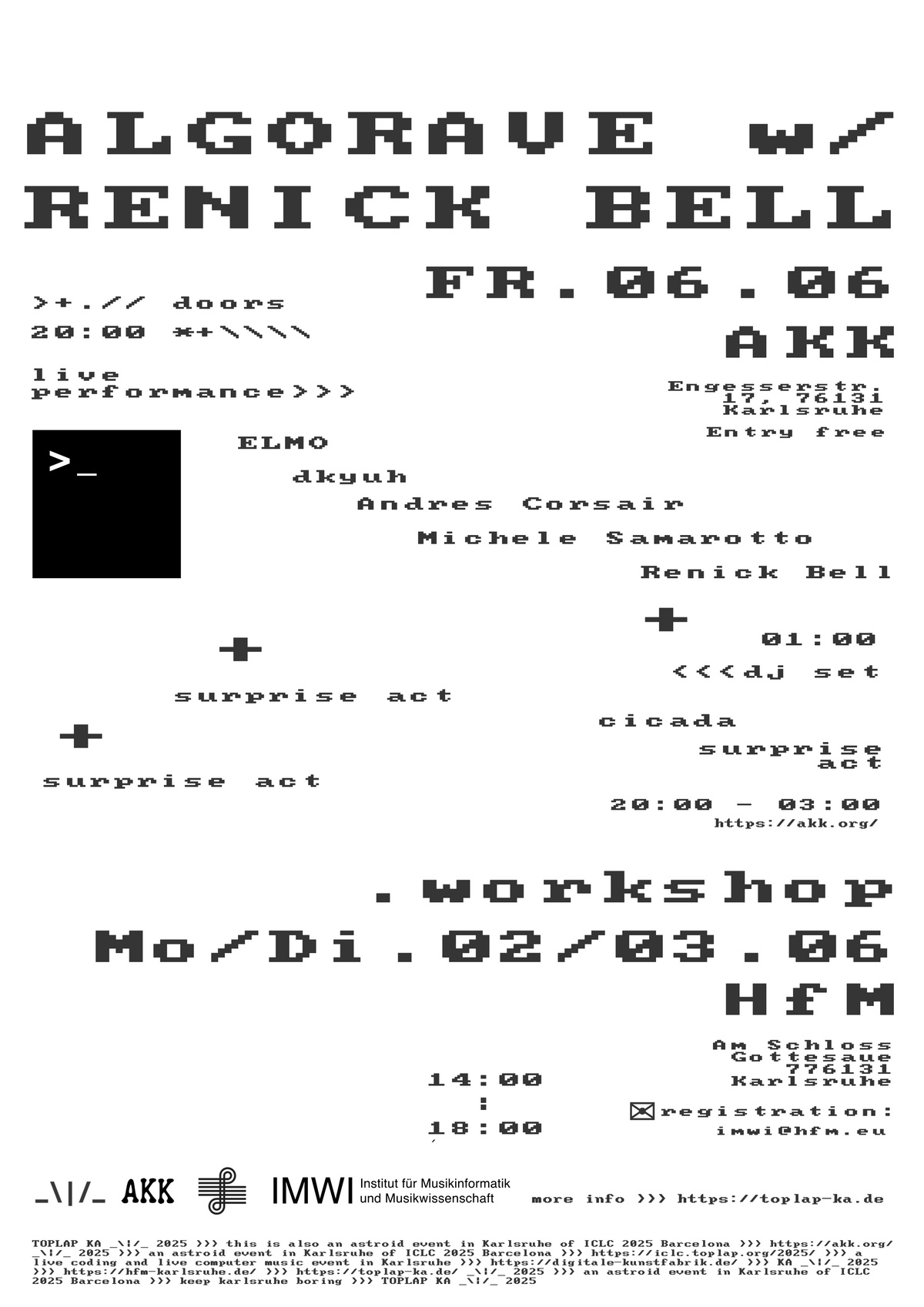 After the blasting night in C2 Ost, TOPLAP Karlsruhe invited Renick Bell as guest to bring another night of club-oriented computer music in AKK.