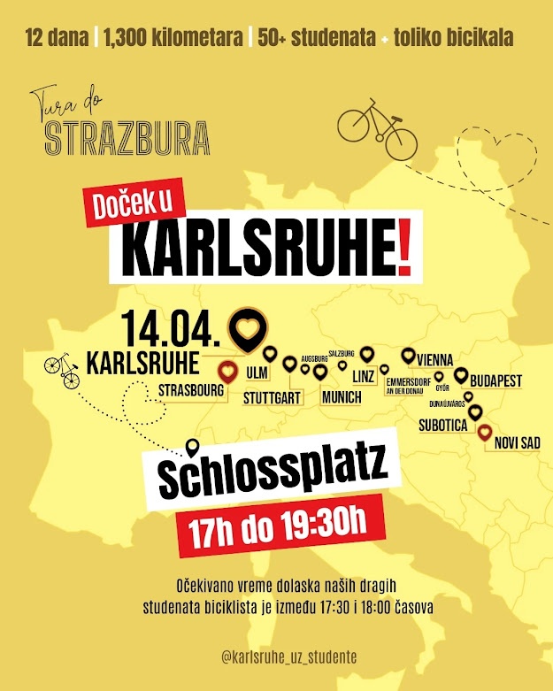 Über 50 Studierende der serbischen Demokratiebewegung fahren derzeit mit dem Fahrrad in 12 Tagen die 1300 km von Belgrad nach Straßburg. Am Montag, den 14. April 2025 werden sie in Karlsruhe eintreffen. Die serbische Community in Karlsruhe begrüßt sie auf dem Schlossplatz.