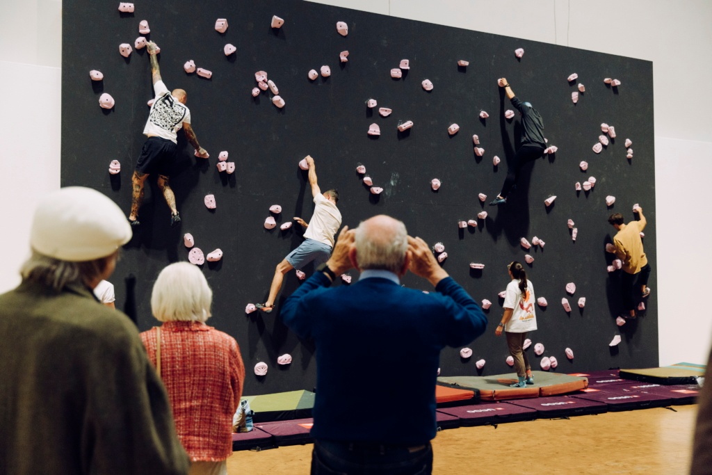 Die Arbeit „Eintritt frei Solo“ in der Ausstellung „Ratatataa“ von Özlem Günyol & Mustafa Kunt lädt freitags ab 14 Uhr das Publikum ein, selbst Teil der Installation zu werden. Die Kletterwand darf bestiegen und erkundet werden.