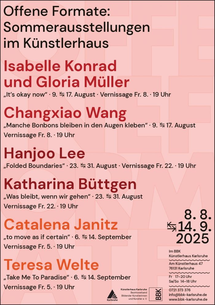 Unter dem Titel „Offene Formate“ haben im Zeitraum vom 8. August bis zum 14. September Künstlerinnen und Künstler die Möglichkeit, die Galerieräume des Künstlerhauses für ein Ausstellungsvorhaben zu nutzen – auch ohne Mitgliedschaft im BBK Karlsruhe. Somit können sechs verschiedene Ausstellungen, teilweise parallel, stattfinden. Gezeigt werden neben altbewährten Präsentationen auch experimentelle und über die klassischen Ausstellungsformen hinausgehende Formate.