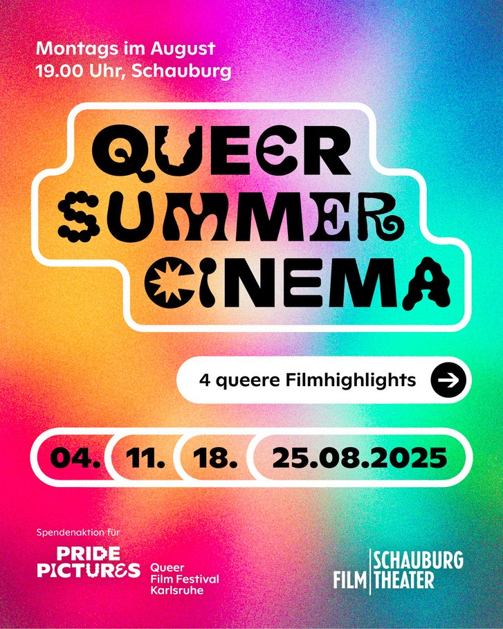 Zum ersten Mal präsentieren die Schauburg und die Pride Pictures e.V. - Queer Film Festival Karlsruhe gemeinsam die Filmreihe QUEER SUMMER CINEMA. Immer montags im August um 19:00 Uhr werden in der Schauburg ausgewählte Filme gezeigt, die queere Perspektiven sichtbar machen – bewegend, humorvoll, politisch und künstlerisch wegweisend.
