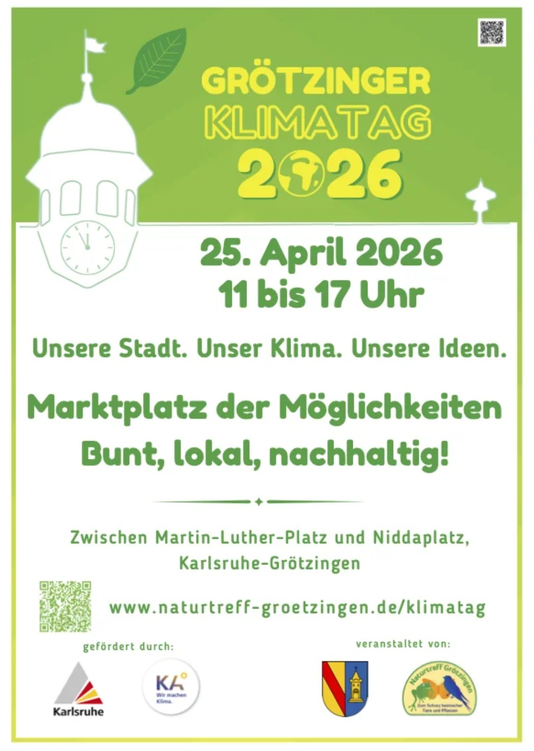 Die Ortverwaltung Grötzingen und der Naturtreff Grötzingen laden zum sechsten Grötzinger Klimatag ein, einem bunten, vielfältigen Markt zum Mitmachen und Vernetzen rund um die Themen Klimaschutz, Naturschutz und Nachhaltigkeit.